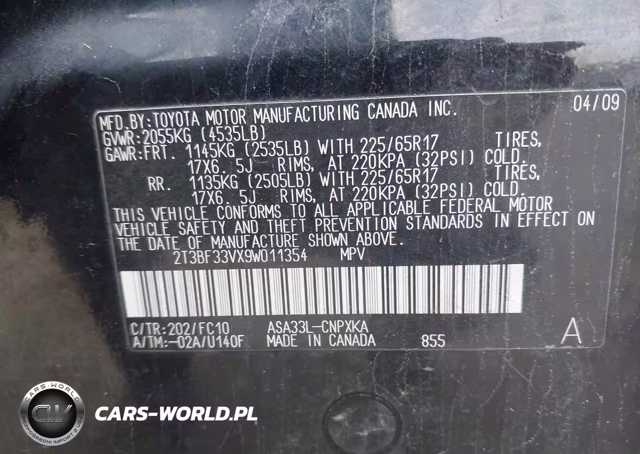 IAAI Nr: I-44721670 VIN: 2T3BF33VX9W011354 Port: Elizabeth, NJ