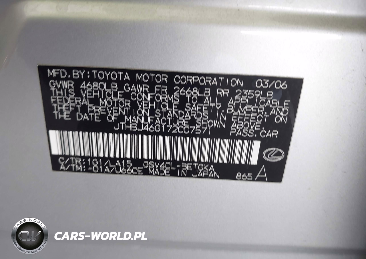 IAAI Nr: I-44725110 VIN: JTHBJ46G172007571 Port: Los Angeles, CA