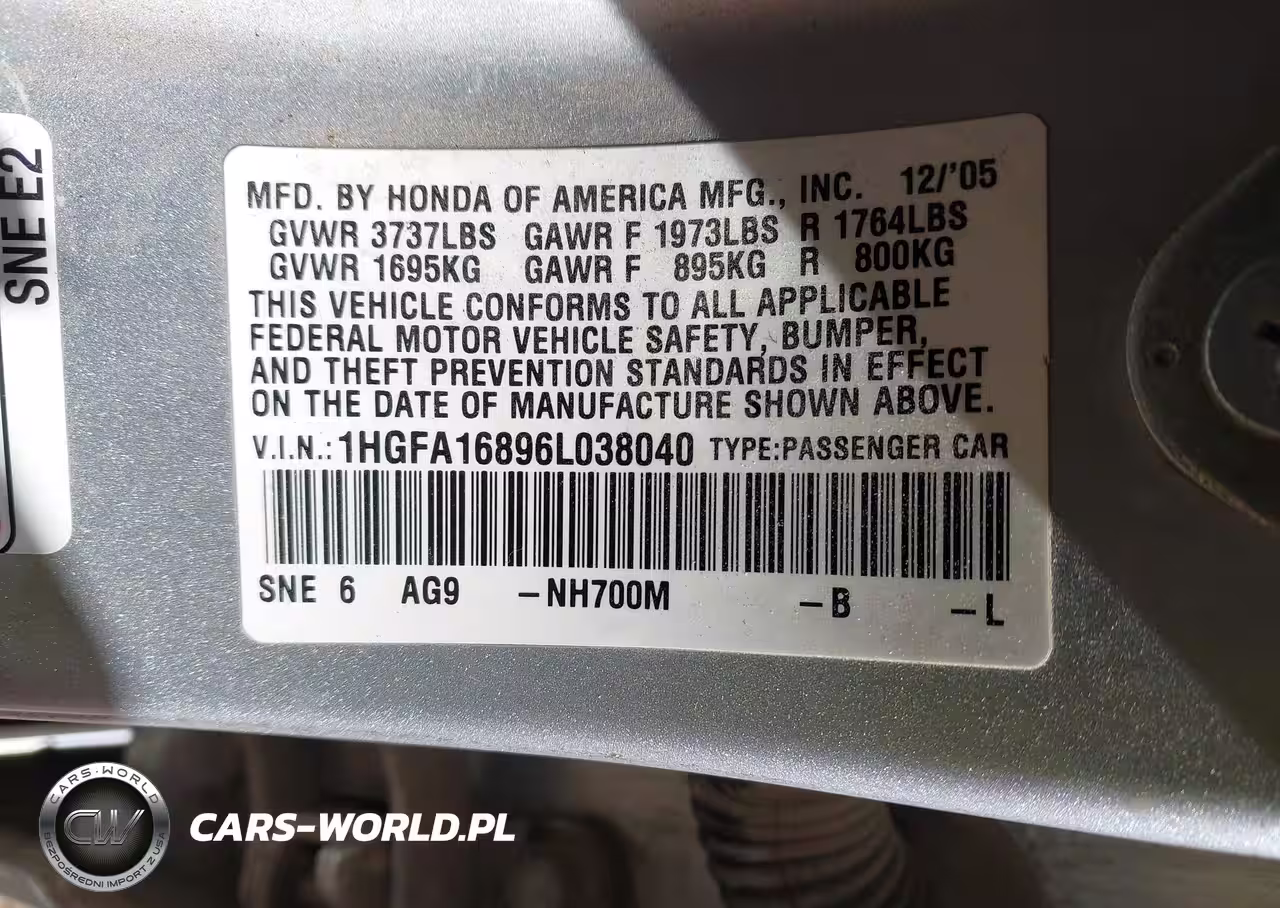 IAAI Nr: I-44726487 VIN: 1HGFA16896L038040 Port: Los Angeles, CA