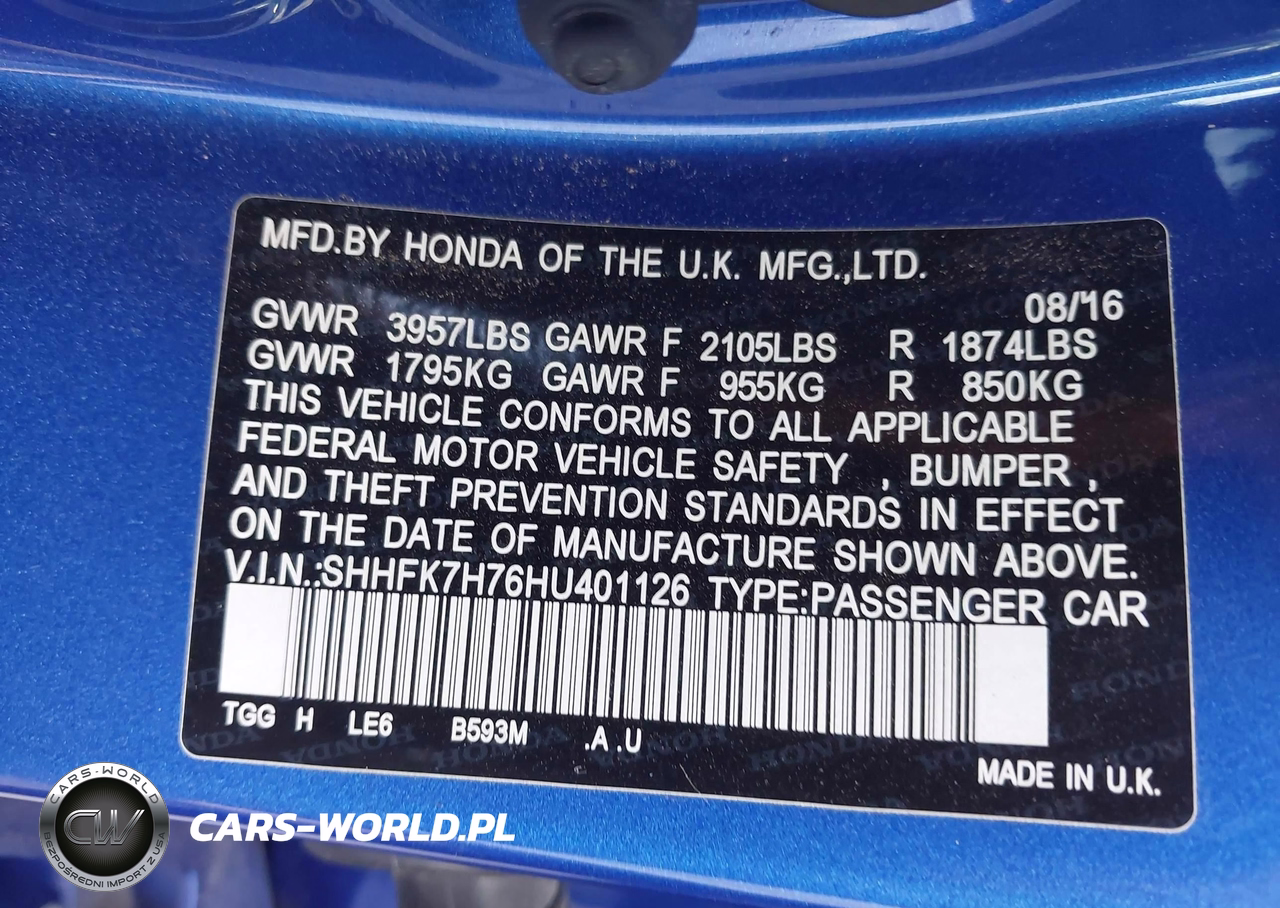 IAAI Nr: I-44730600 VIN: SHHFK7H76HU401126 Port: Houston, TX