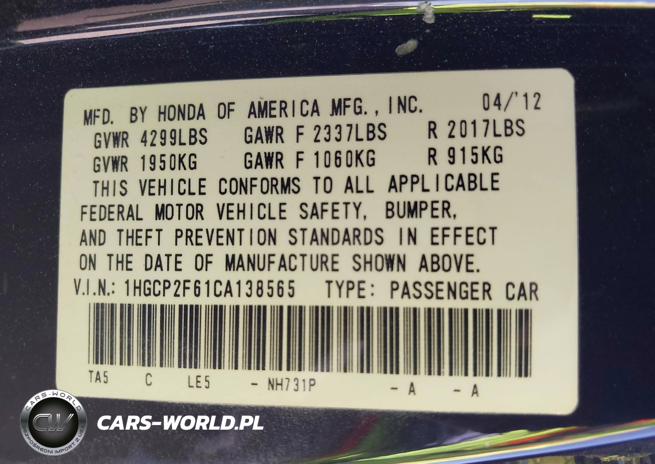IAAI Nr: I-44731231 VIN: 1HGCP2F61CA138565 Port: Los Angeles, CA