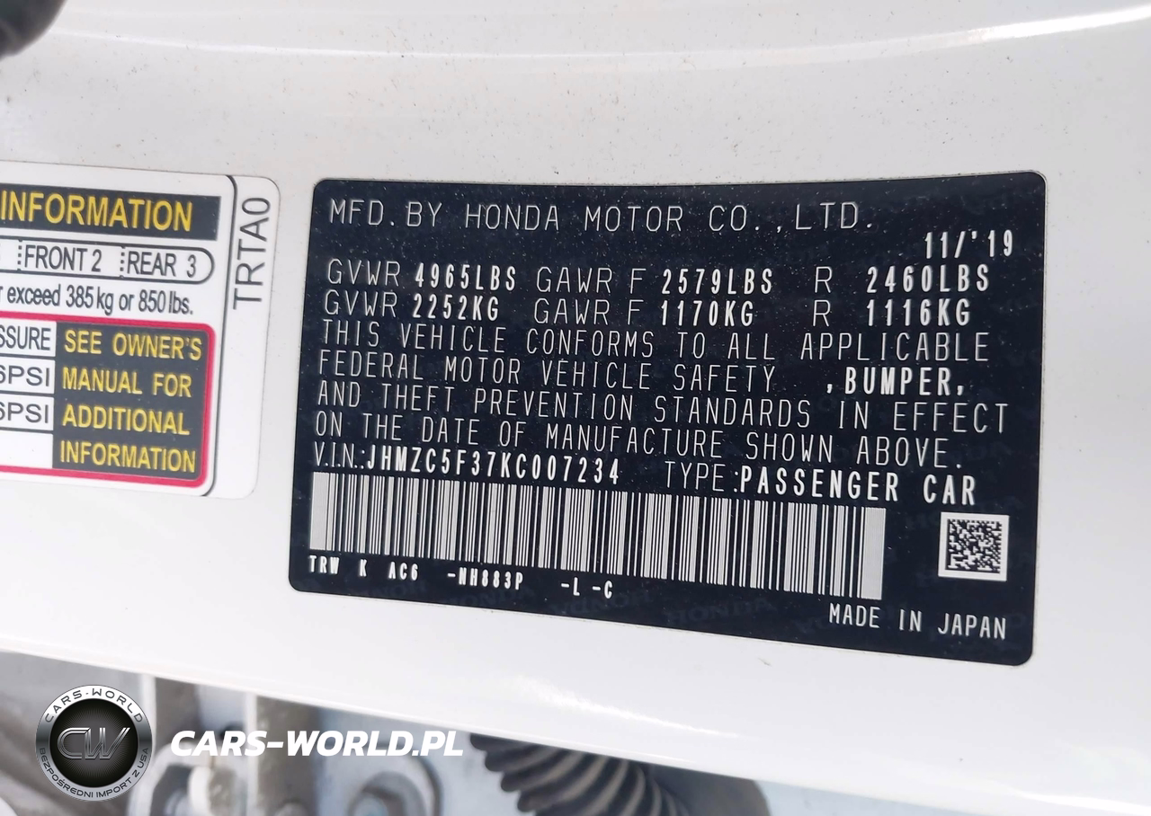 IAAI Nr: I-44733013 VIN: JHMZC5F37KC007234 Port: Los Angeles, CA