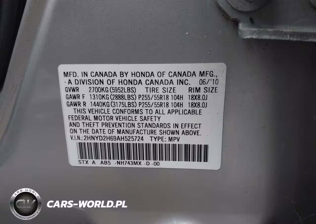 IAAI Nr: I-44738219 VIN: 2HNYD2H69AH525724 Port: Elizabeth, NJ
