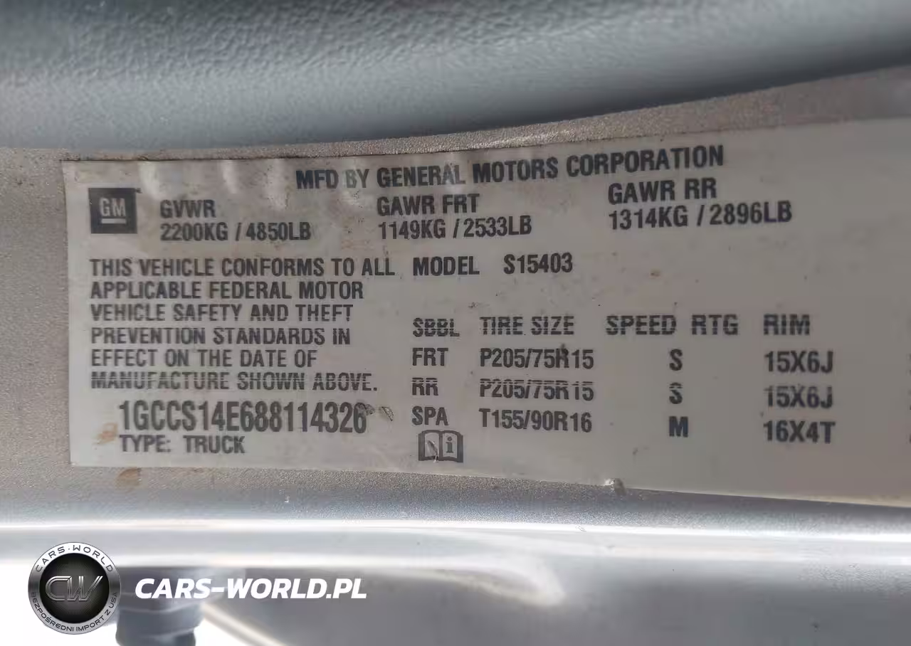 IAAI Nr: I-44740062 VIN: 1GCCS14E688114326 Port: Elizabeth, NJ