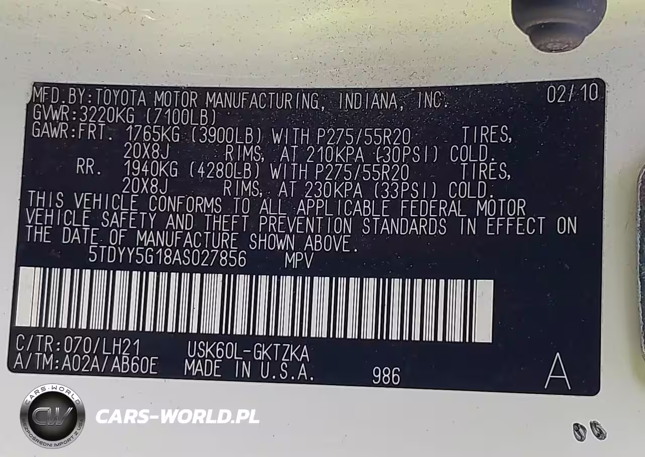 IAAI Nr: I-44745683 VIN: 5TDYY5G18AS027856 Port: Houston, TX