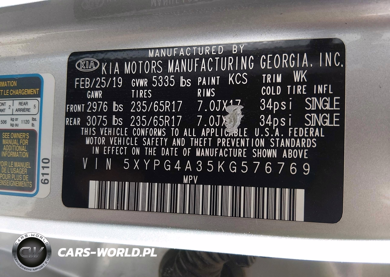 IAAI Nr: I-44747041 VIN: 5XYPG4A35KG576769 Port: Savannah, GA