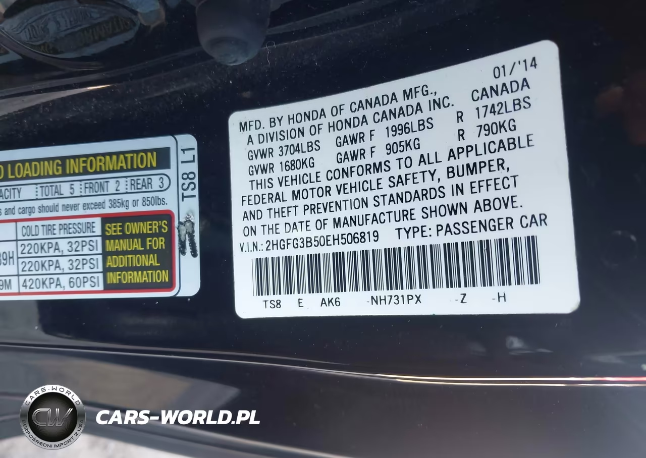 IAAI Nr: I-44747502 VIN: 2HGFG3B50EH506819 Port: Elizabeth, NJ