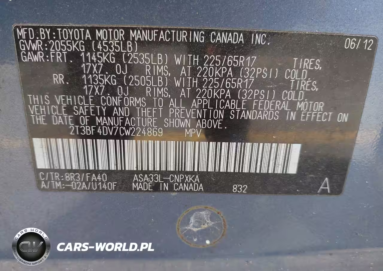 IAAI Nr: I-44749907 VIN: 2T3BF4DV7CW224869 Port: Savannah, GA