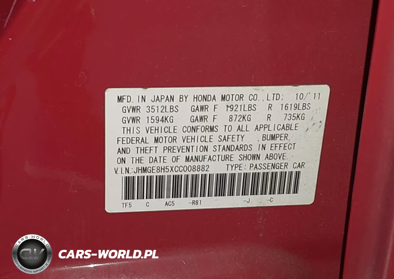 IAAI Nr: I-44751638 VIN: JHMGE8H5XCC008882 Port: Indianapolis, IN