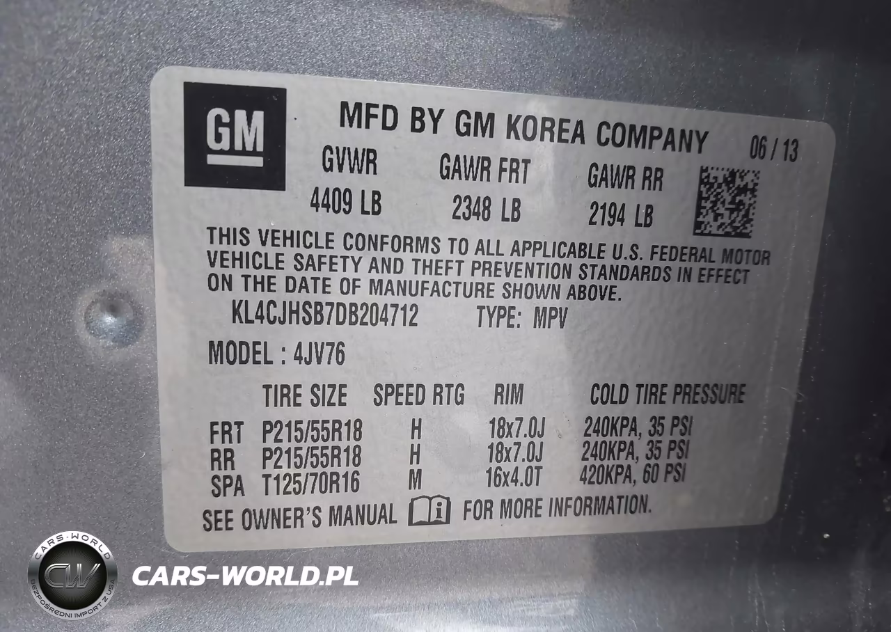 IAAI Nr: I-44756959 VIN: KL4CJHSB7DB204712 Port: Indianapolis, IN