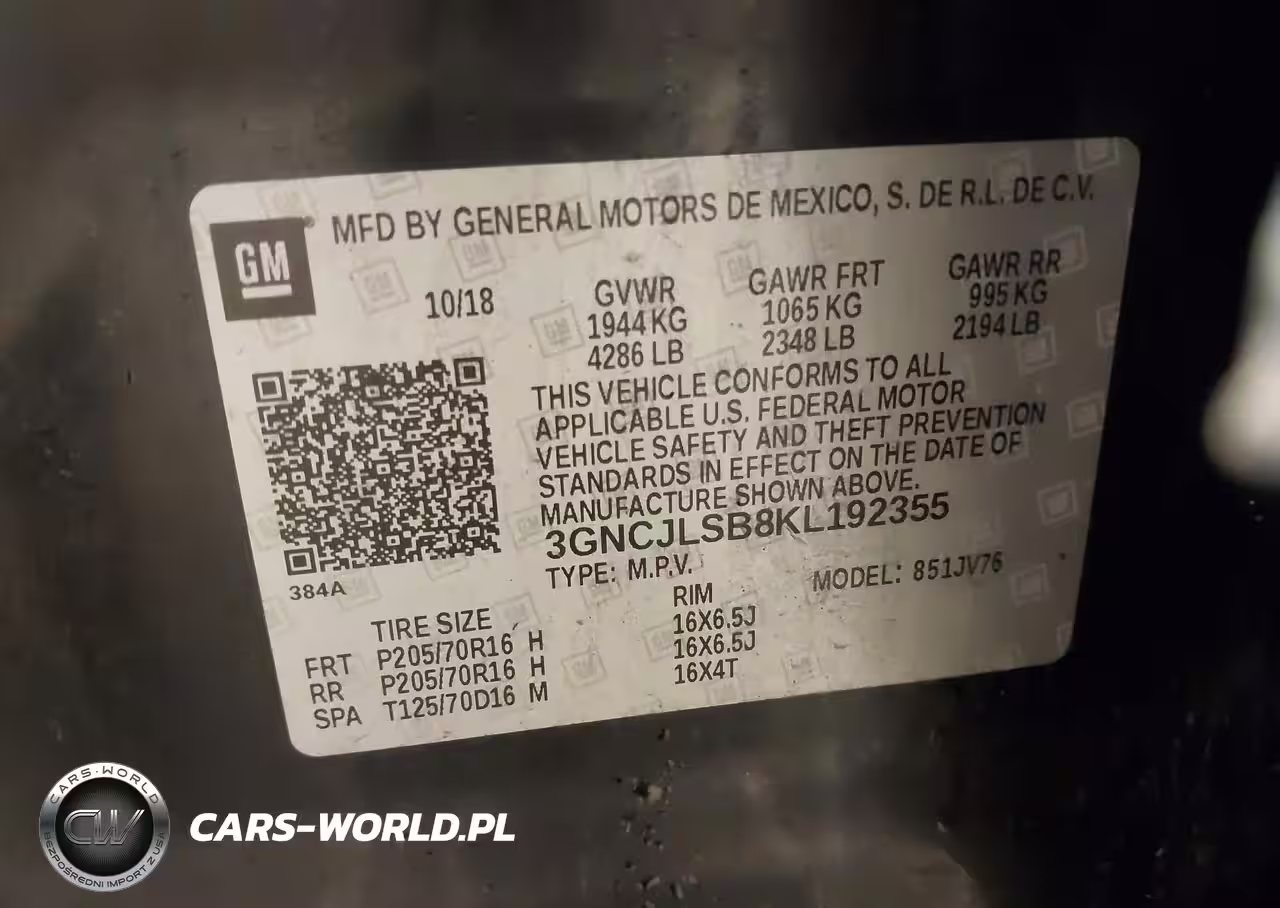 IAAI Nr: I-44757761 VIN: 3GNCJLSB8KL192355 Port: Elizabeth, NJ