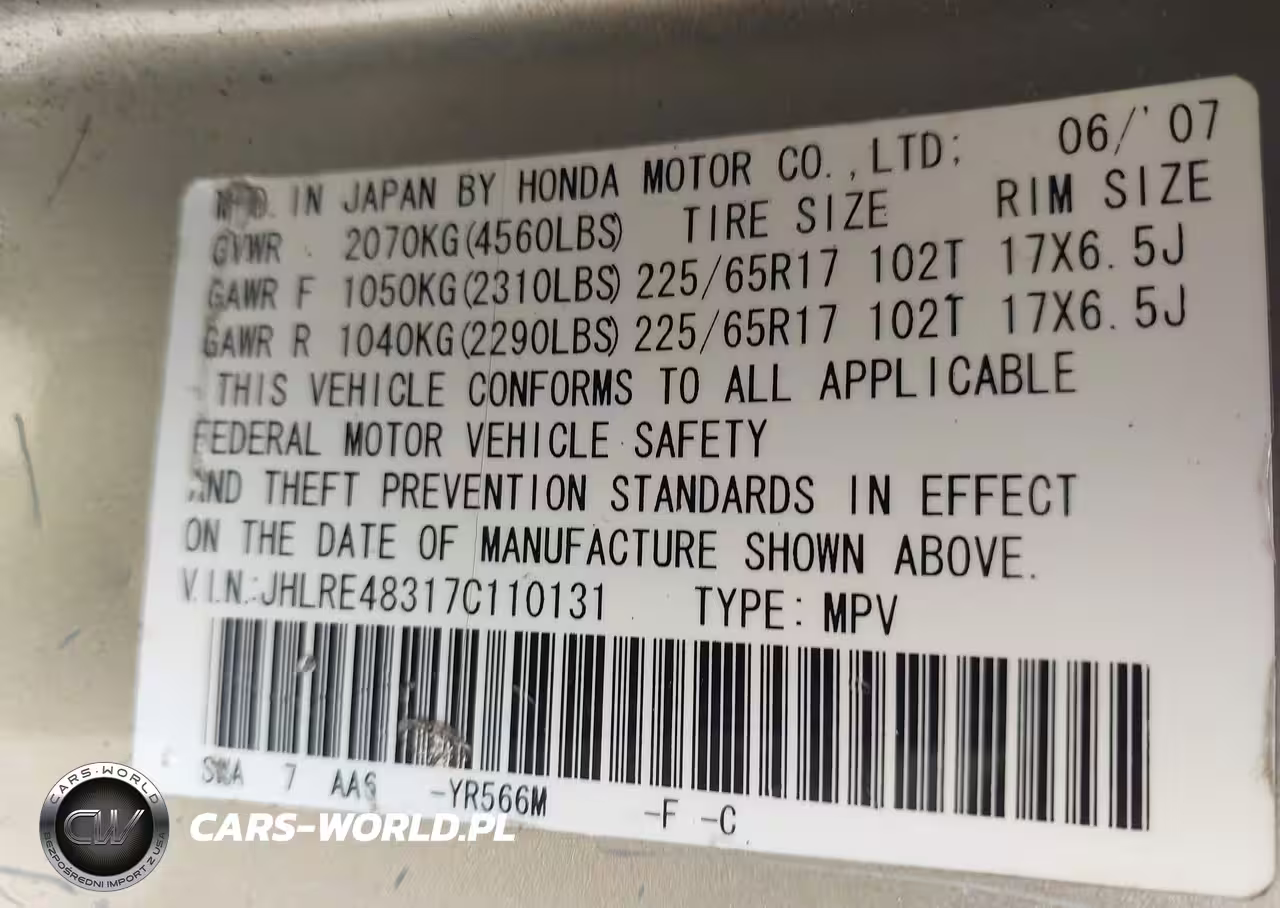IAAI Nr: I-44763512 VIN: JHLRE48317C110131 Port: Elizabeth, NJ