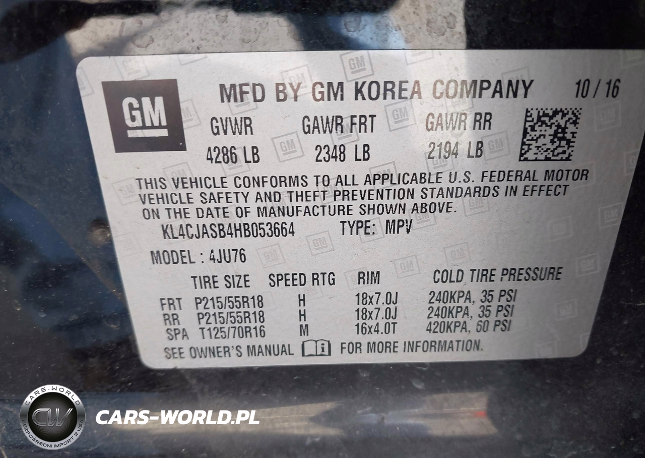 IAAI Nr: I-44769085 VIN: KL4CJASB4HB053664 Port: Savannah, GA