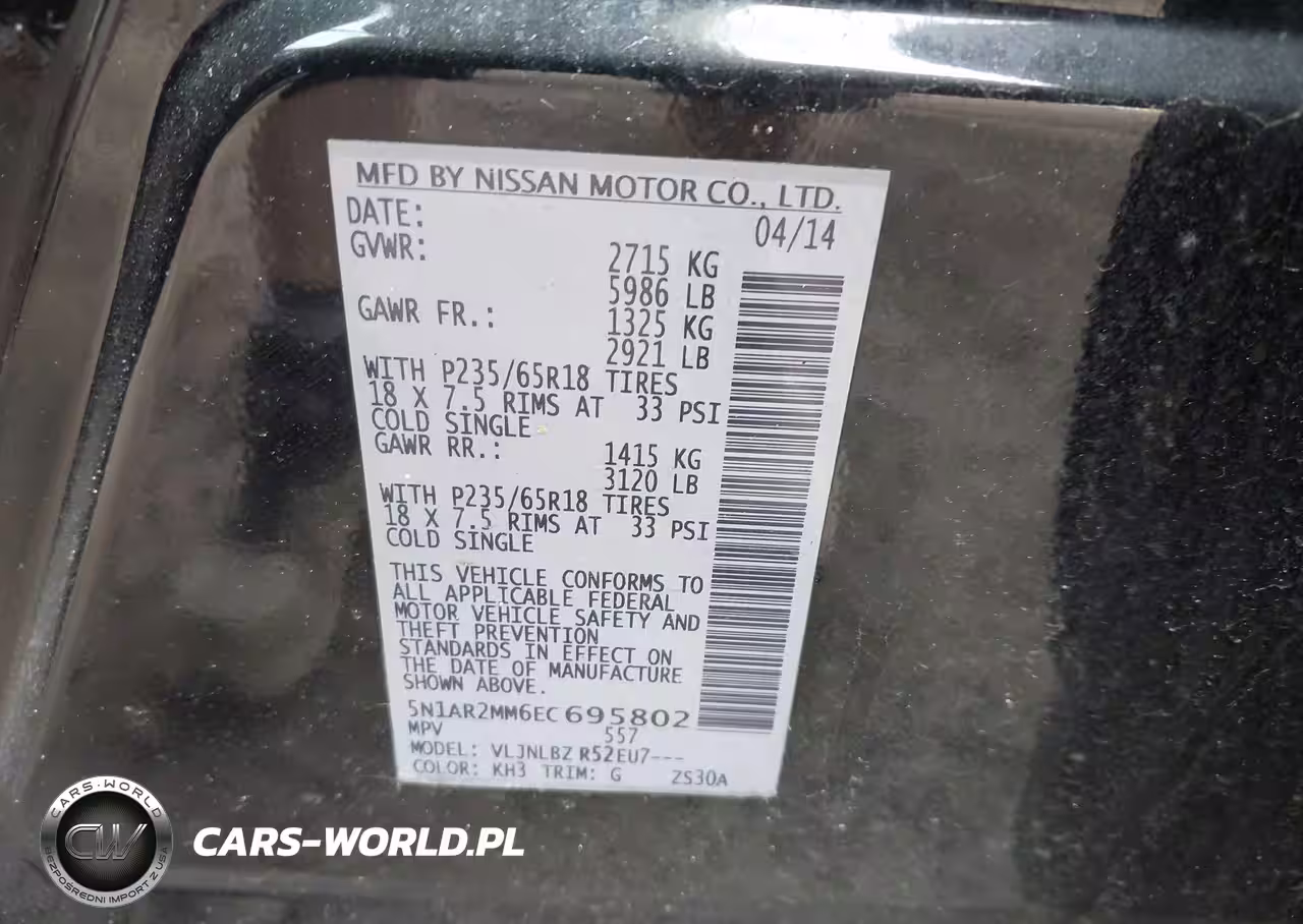 IAAI Nr: I-44770322 VIN: 5N1AR2MM6EC695802 Port: Elizabeth, NJ