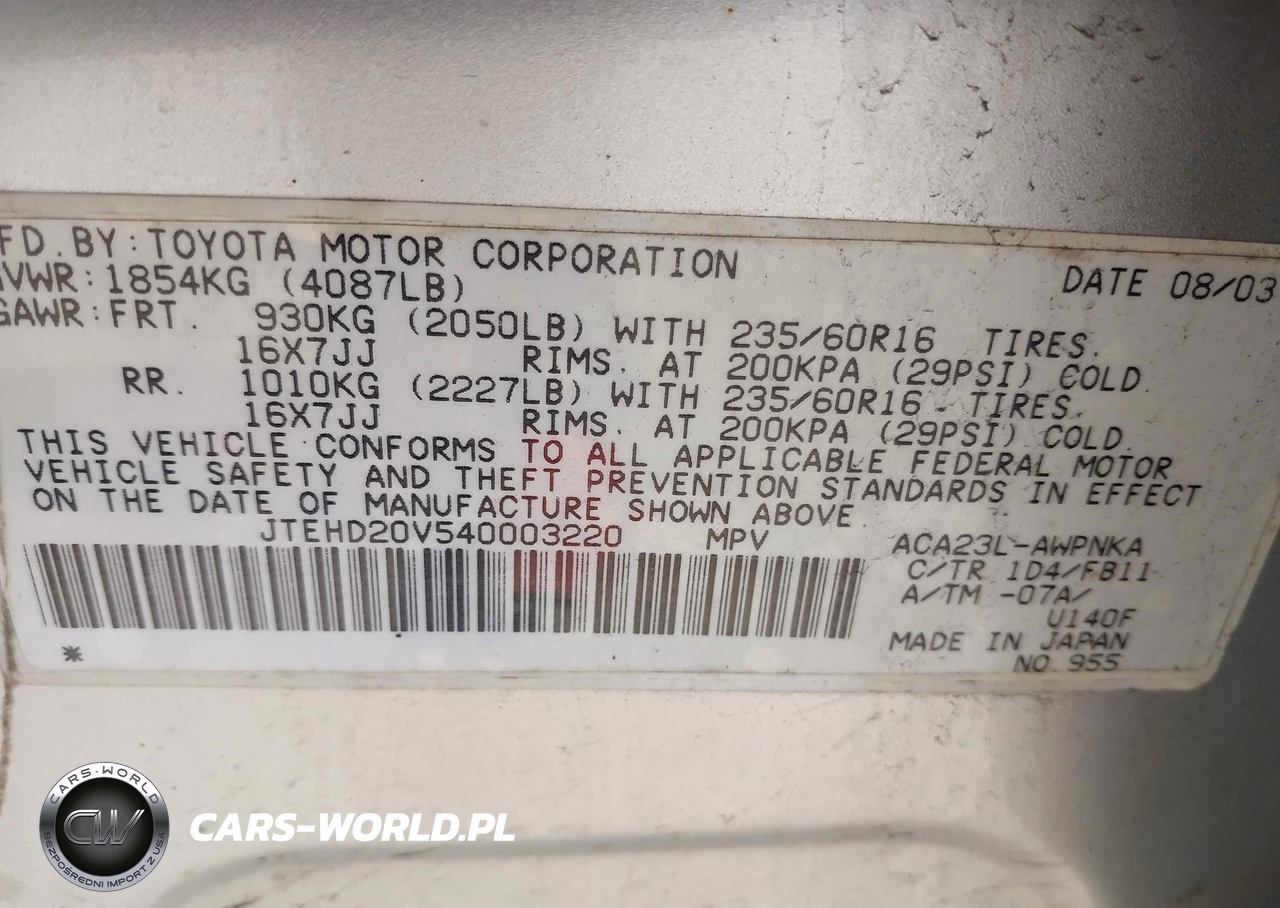 IAAI Nr: I-44771193 VIN: JTEHD20V540003220 Port: Elizabeth, NJ