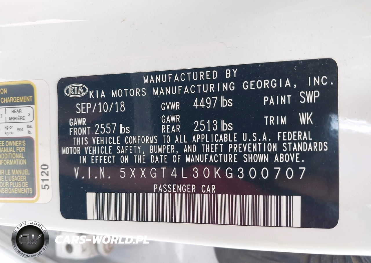 IAAI Nr: I-44774278 VIN: 5XXGT4L30KG300707 Port: Houston, TX