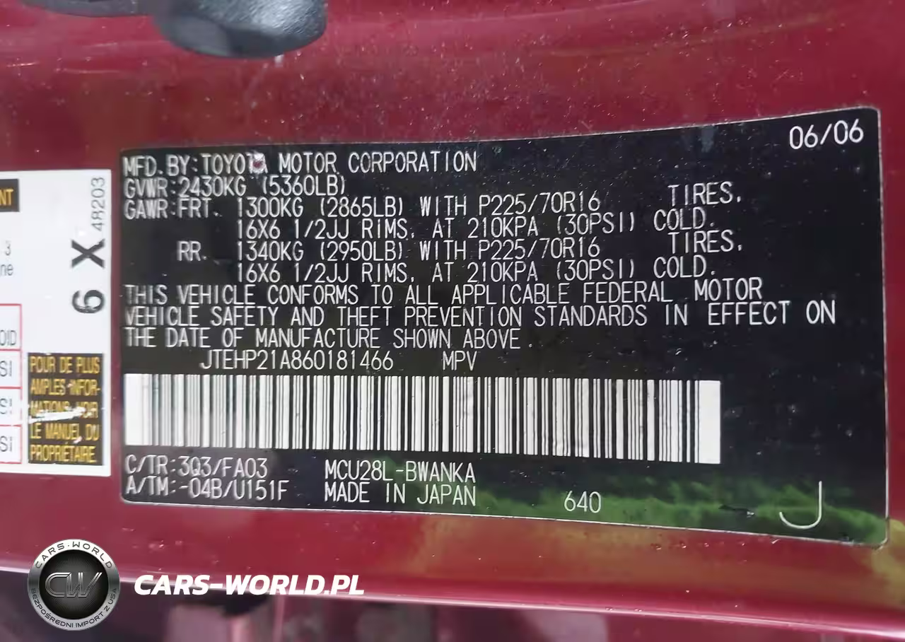 IAAI Nr: I-44776593 VIN: JTEHP21A860181466 Port: Elizabeth, NJ