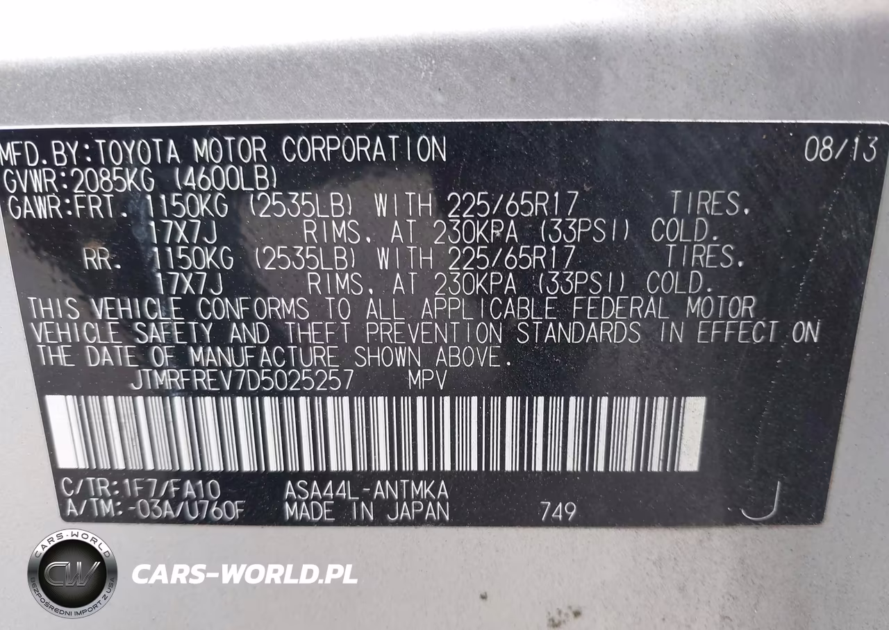 IAAI Nr: I-44778259 VIN: JTMRFREV7D5025257 Port: Savannah, GA