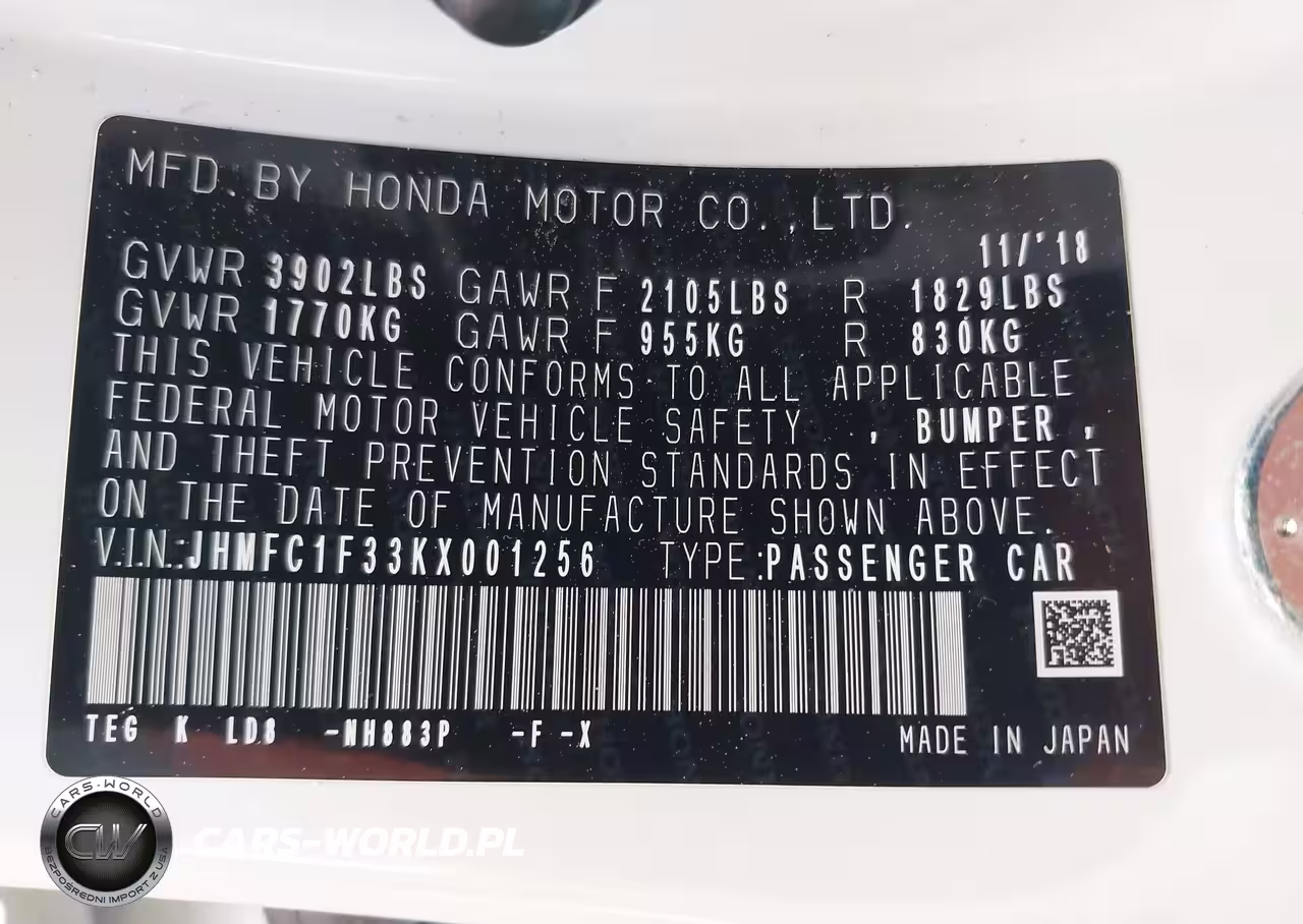 IAAI Nr: I-44778264 VIN: JHMFC1F33KX001256 Port: Savannah, GA