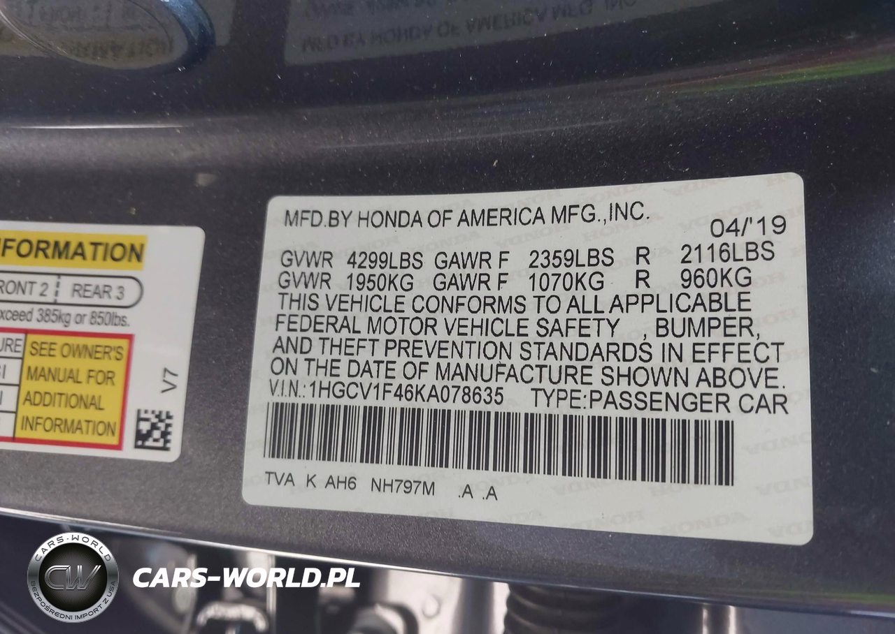 IAAI Nr: I-44780973 VIN: 1HGCV1F46KA078635 Port: Los Angeles, CA