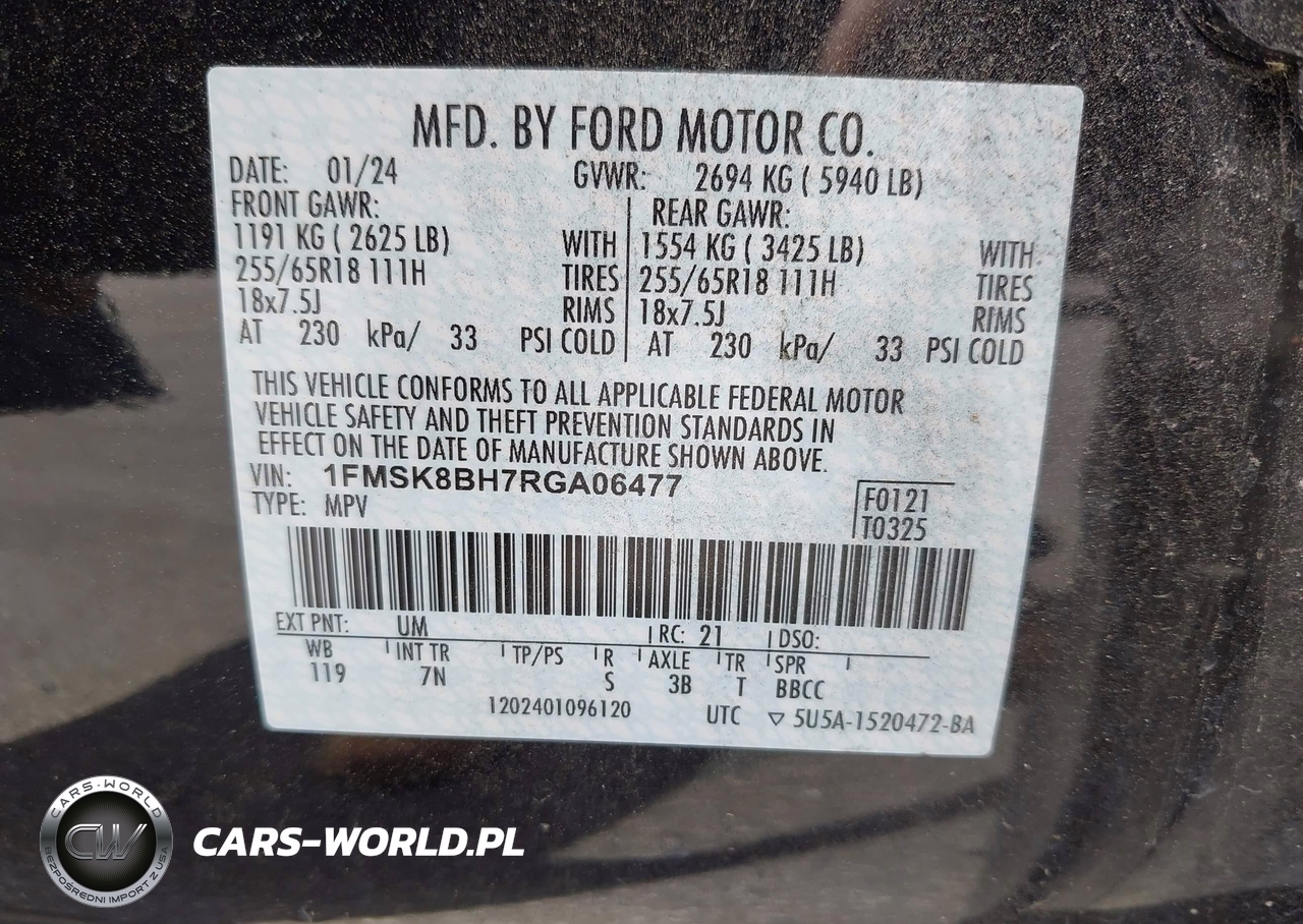 IAAI Nr: I-44782396 VIN: 1FMSK8BH7RGA06477 Port: Savannah, GA