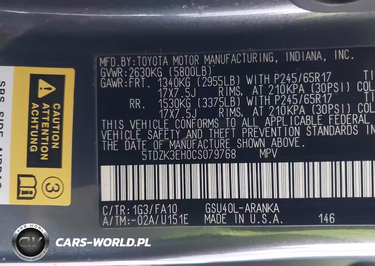 IAAI Nr: I-44785472 VIN: 5TDZK3EH0CS079768 Port: Los Angeles, CA