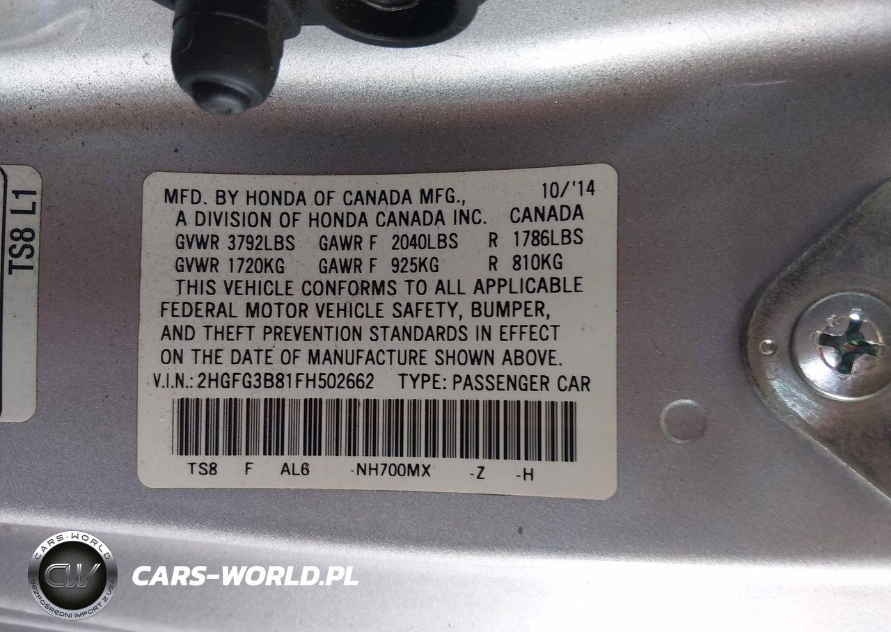 IAAI Nr: I-44786462 VIN: 2HGFG3B81FH502662 Port: Los Angeles, CA