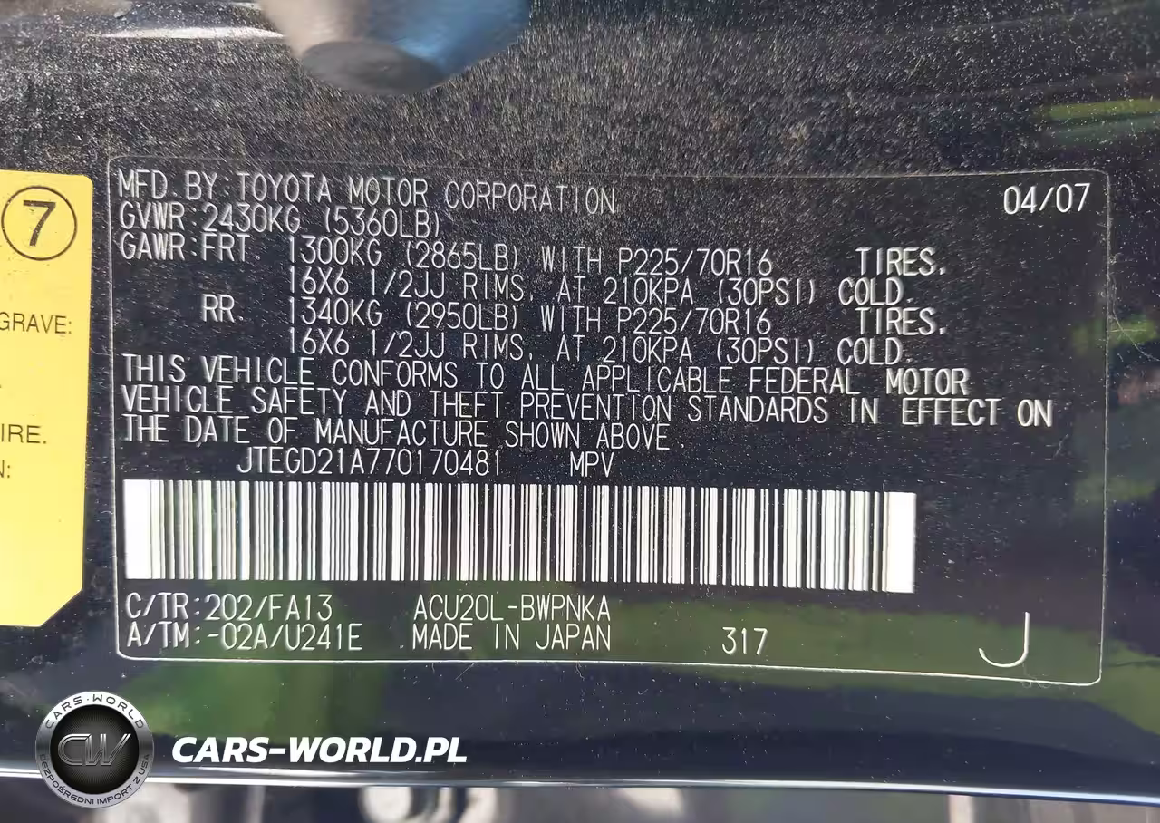 IAAI Nr: I-44794242 VIN: JTEGD21A770170481 Port: Houston, TX