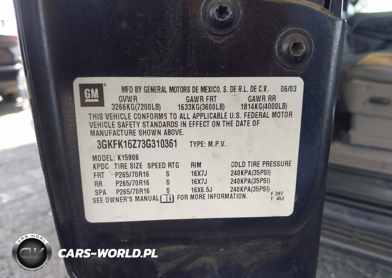 IAAI Nr: I-44799925 VIN: 3GKFK16Z73G310361 Port: Los Angeles, CA