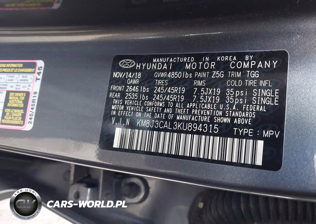 IAAI Nr: I-44801280 VIN: KM8J3CAL3KU894315 Port: Elizabeth, NJ