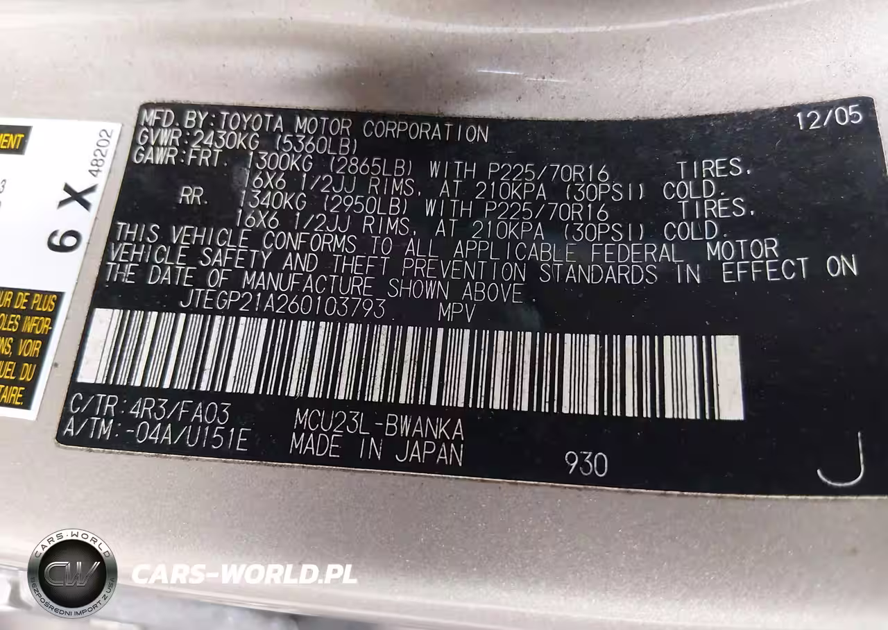 IAAI Nr: I-44801868 VIN: JTEGP21A260103793 Port: Savannah, GA