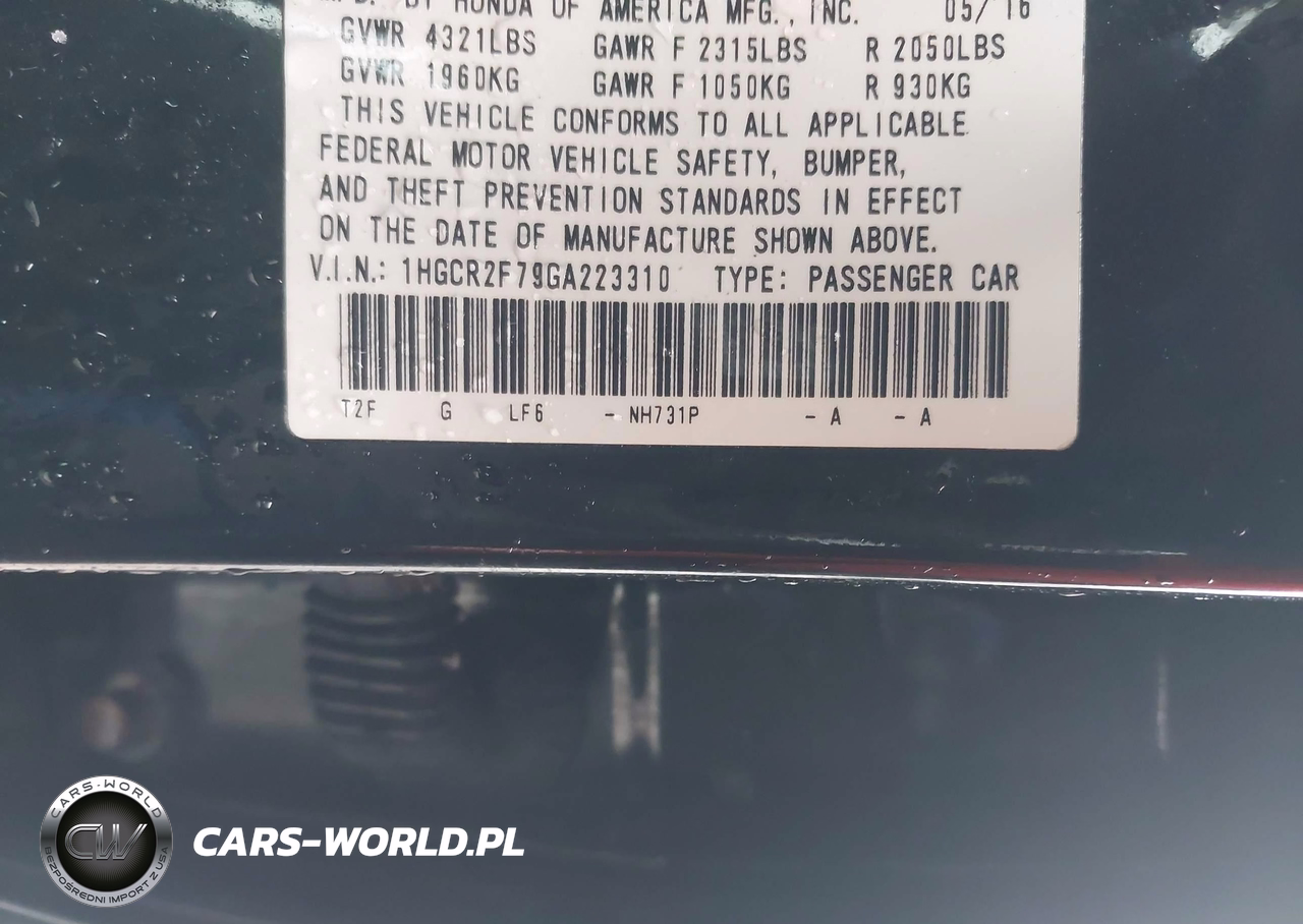 IAAI Nr: I-44801977 VIN: 1HGCR2F79GA223310 Port: Elizabeth, NJ