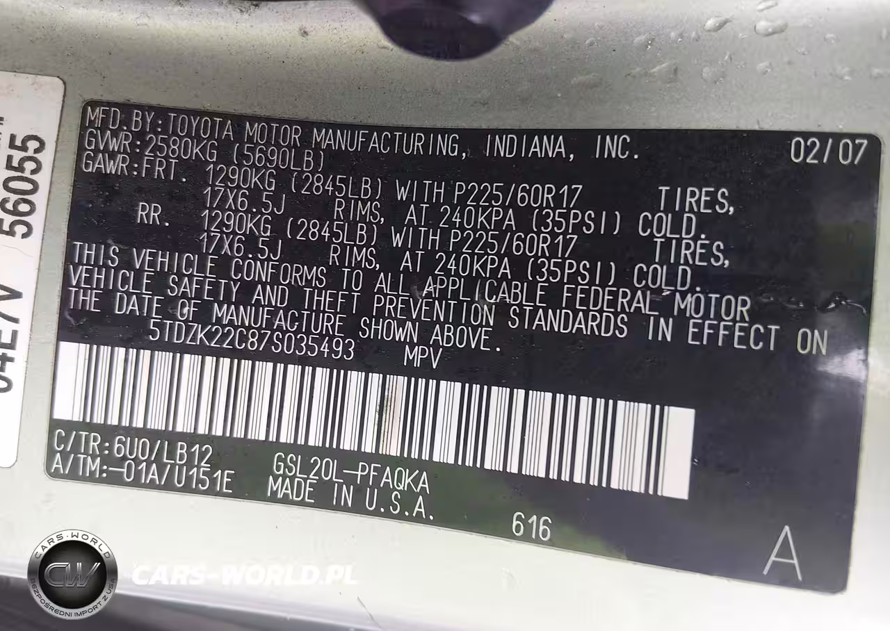 IAAI Nr: I-44802498 VIN: 5TDZK22C87S035493 Port: Elizabeth, NJ