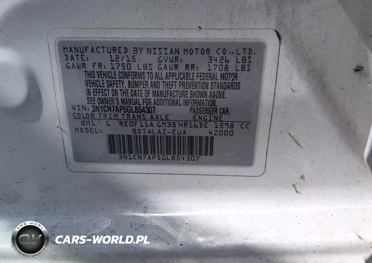 IAAI Nr: I-44802534 VIN: 3N1CN7AP5GL854307 Port: Elizabeth, NJ
