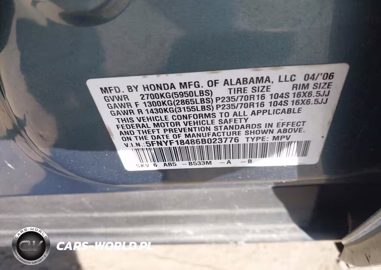 IAAI Nr: I-44803020 VIN: 5FNYF18486B023776 Port: Elizabeth, NJ