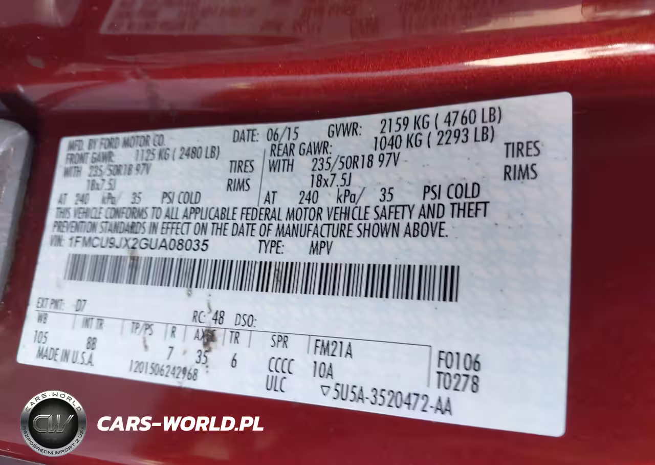 IAAI Nr: I-44803994 VIN: 1FMCU9JX2GUA08035 Port: Savannah, GA