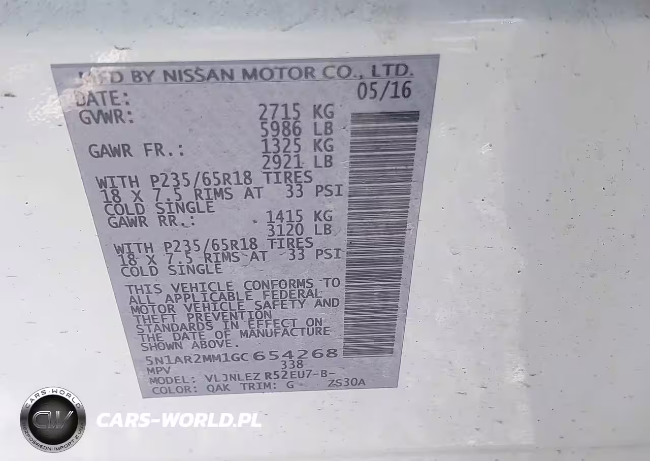 IAAI Nr: I-44806001 VIN: 5N1AR2MM1GC654268 Port: Elizabeth, NJ