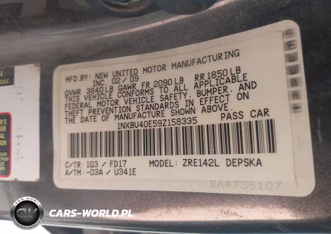 IAAI Nr: I-44807104 VIN: 1NXBU40E59Z158335 Port: Los Angeles, CA