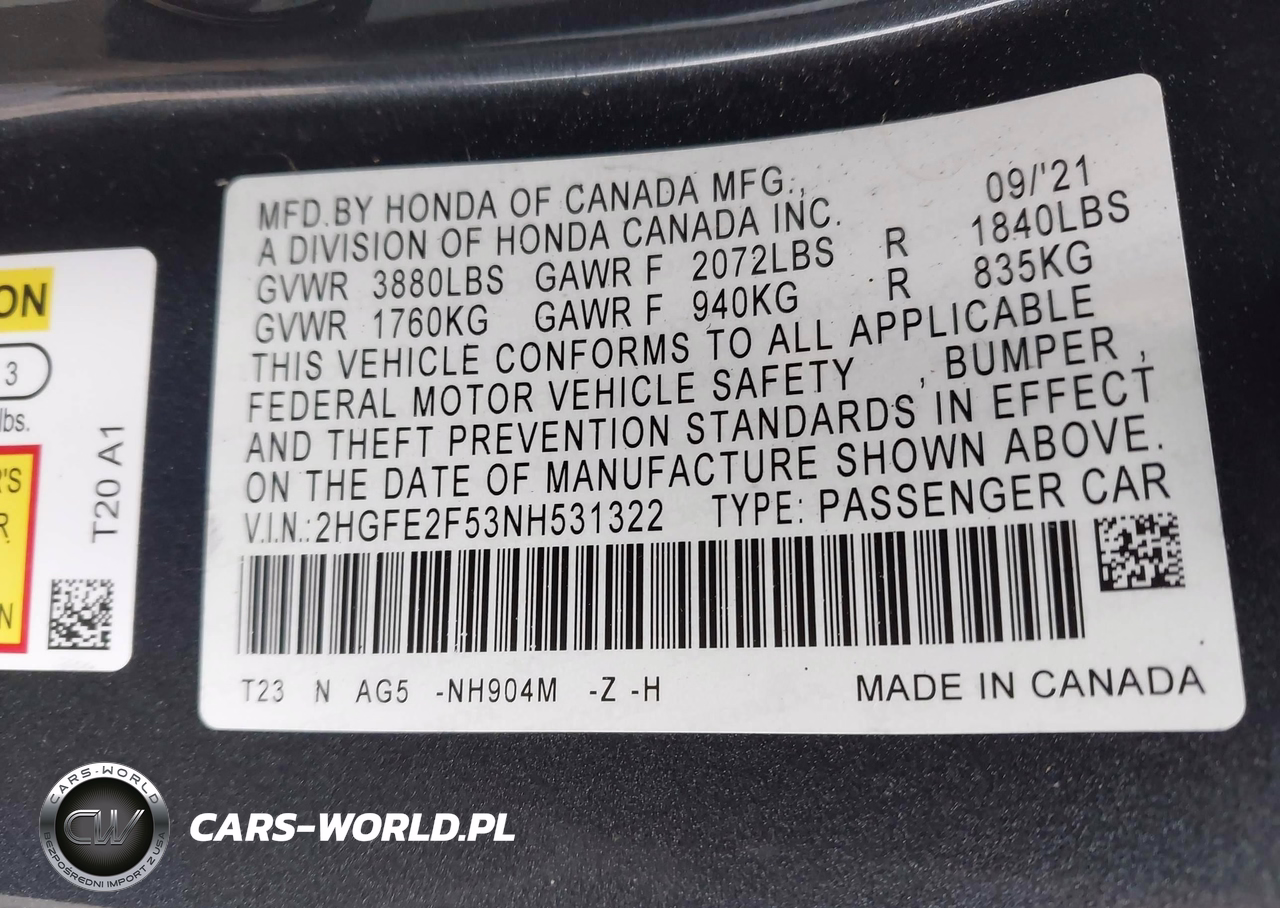 IAAI Nr: I-44807202 VIN: 2HGFE2F53NH531322 Port: Los Angeles, CA