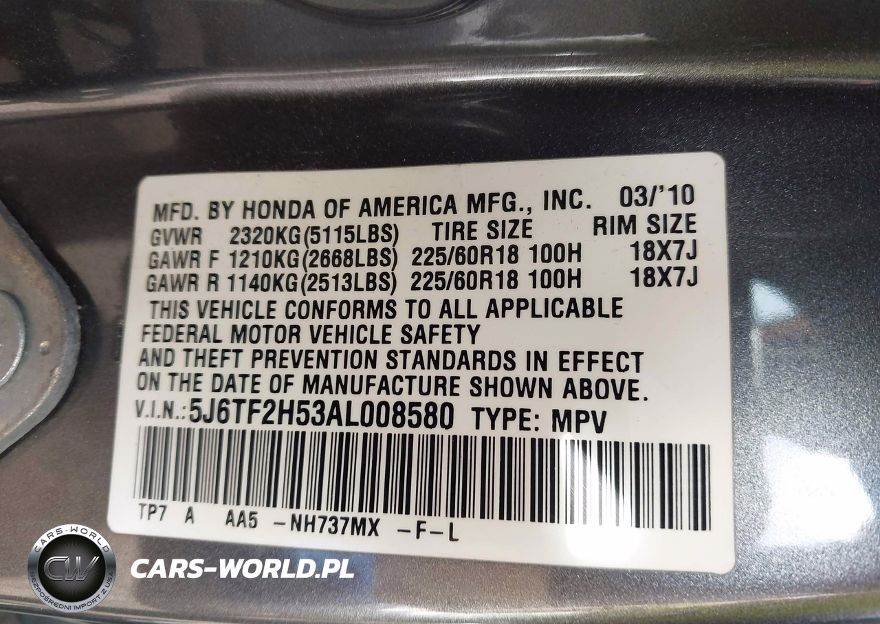 IAAI Nr: I-44808495 VIN: 5J6TF2H53AL008580 Port: Elizabeth, NJ