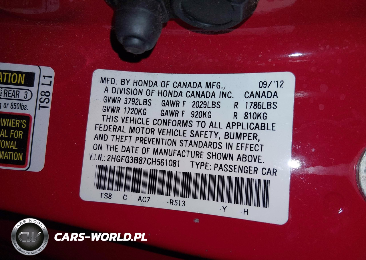 IAAI Nr: I-44808899 VIN: 2HGFG3B87CH561081 Port: Los Angeles, CA