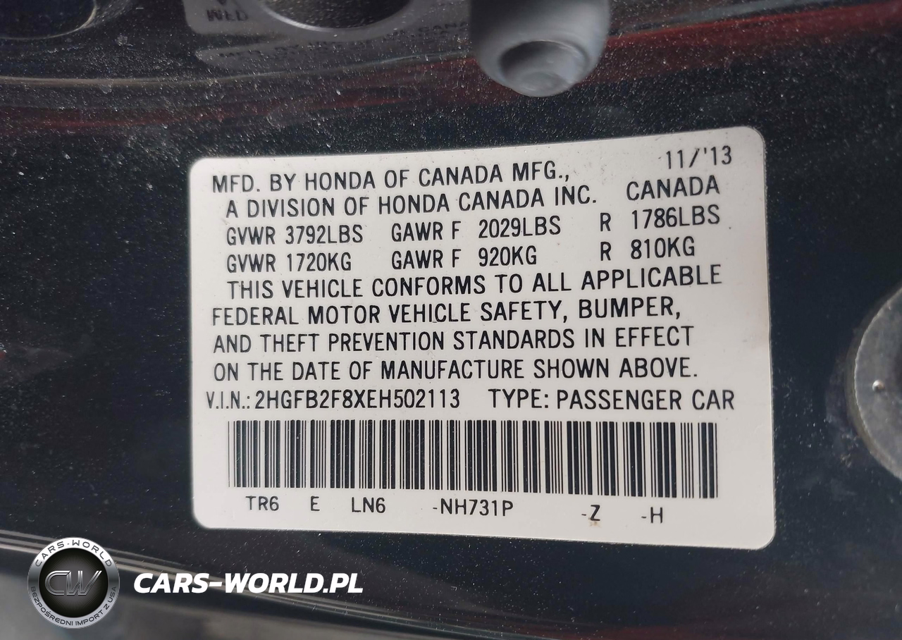 IAAI Nr: I-44812125 VIN: 2HGFB2F8XEH502113 Port: Elizabeth, NJ