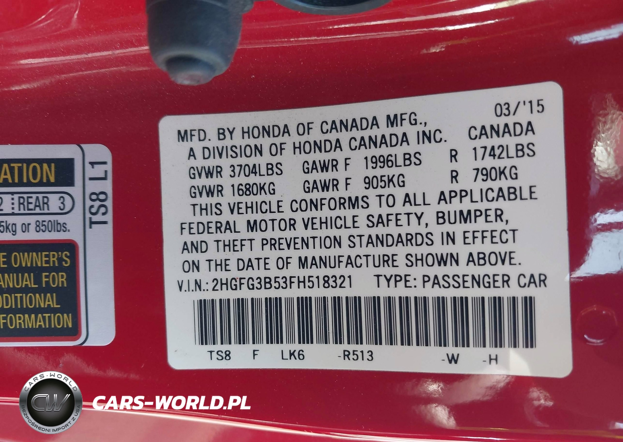 IAAI Nr: I-44817701 VIN: 2HGFG3B53FH518321 Port: Los Angeles, CA