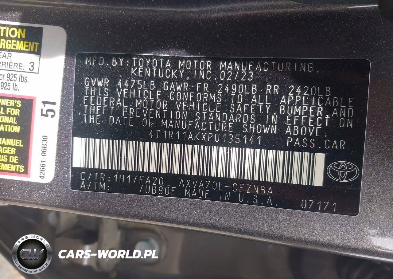 IAAI Nr: I-44818488 VIN: 4T1R11AKXPU135141 Port: Los Angeles, CA