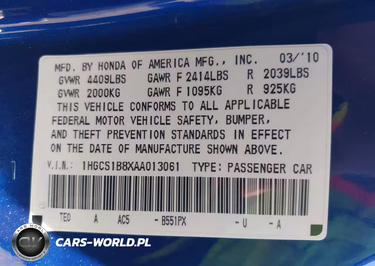 IAAI Nr: I-44822418 VIN: 1HGCS1B8XAA013061 Port: Elizabeth, NJ