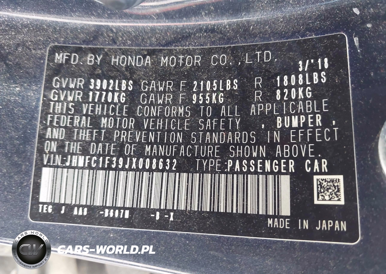 IAAI Nr: I-44829230 VIN: JHMFC1F39JX008632 Port: Savannah, GA