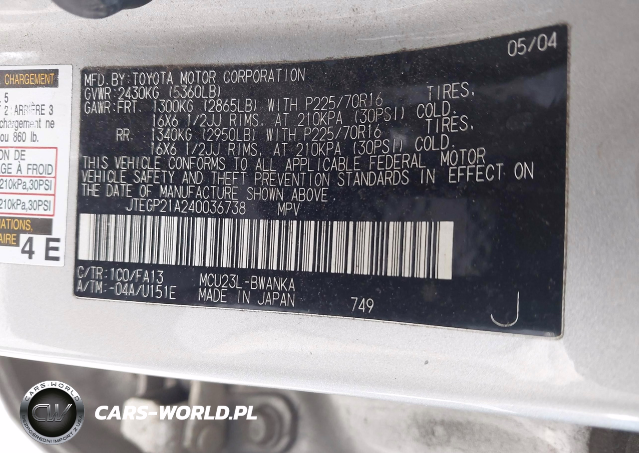 IAAI Nr: I-44829428 VIN: JTEGP21A240036738 Port: Savannah, GA