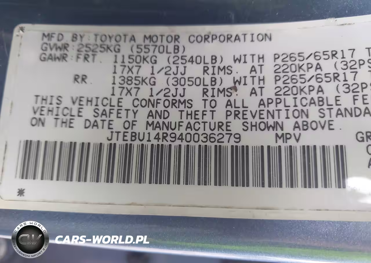 IAAI Nr: I-44832456 VIN: JTEBU14R940036279 Port: Elizabeth, NJ