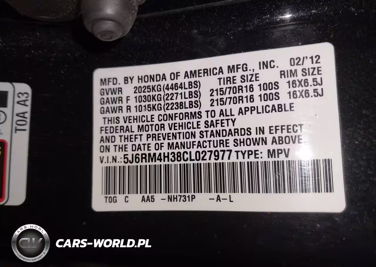 IAAI Nr: I-44833031 VIN: 5J6RM4H38CL027977 Port: Elizabeth, NJ