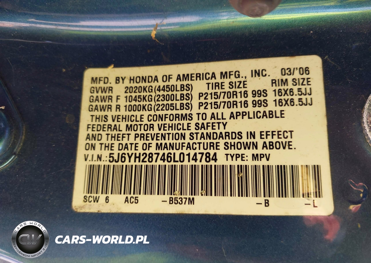 IAAI Nr: I-44834404 VIN: 5J6YH28746L014784 Port: Elizabeth, NJ
